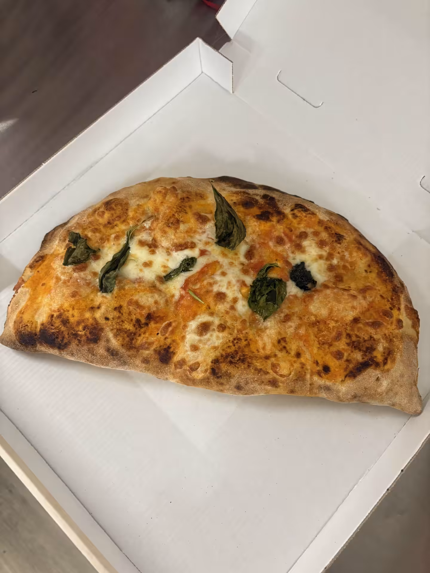 Gefüllte Pizza mit: Fior di Latte Mozzarella, Tomatensauce, Schinken, frischen Champignons, Ei, Parmesan, Basilikum, Ei