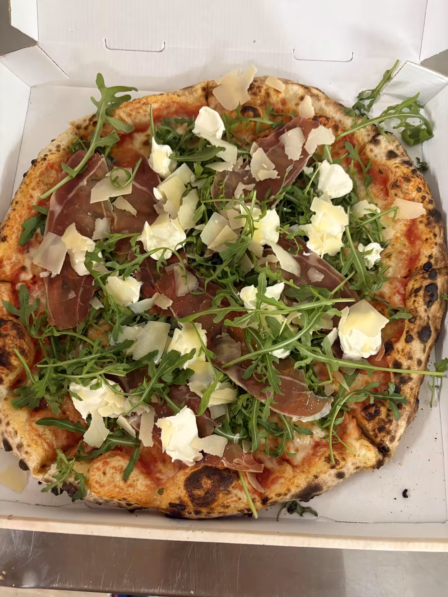 Tomatensauce, Mozzarella, roher Schinken, Rucola, Mascarpone, Parmesanspänen, Olivenöl